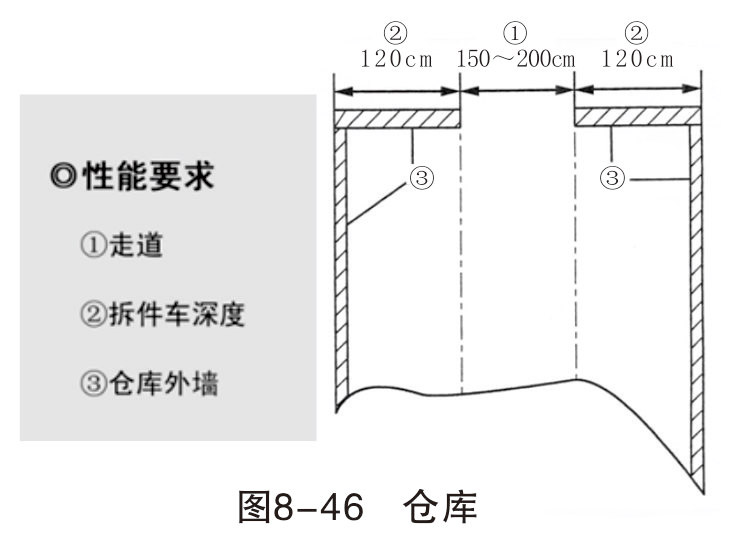 一個(gè)好的鈑金作業(yè)區(qū),必須要有一個(gè)良好的板件拆卸零件和材料倉庫來配合,使整個(gè)廠區(qū)整潔。倉庫面積大約是鈑金工位的2~3倍即可。如圖8-46所示。