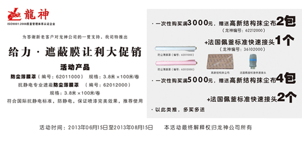 一次性購買滿3000元,贈送高新結(jié)構(gòu)抺塵布(龍神編號:62212000)2包+法國佩釜標(biāo)準(zhǔn)快速接頭(龍神編號:36102000)1個(gè)