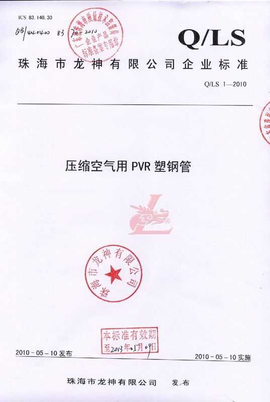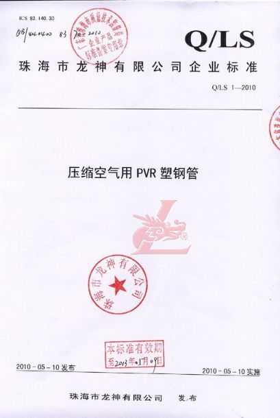 龍神壓縮空氣PVR塑鋼管成功申請(qǐng)企業(yè)執(zhí)行標(biāo)準(zhǔn) 2010年5月珠海市龍神有限公司“壓縮空氣PVR塑鋼管”得到珠海市質(zhì)量技術(shù)監(jiān)督局認(rèn)可,特此頒發(fā)“壓縮空氣PVR塑鋼管企業(yè)執(zhí)行標(biāo)準(zhǔn)”,龍神公司在嚴(yán)格執(zhí)行標(biāo)準(zhǔn)下,保證產(chǎn)品質(zhì)量。 2010-05-20 9916