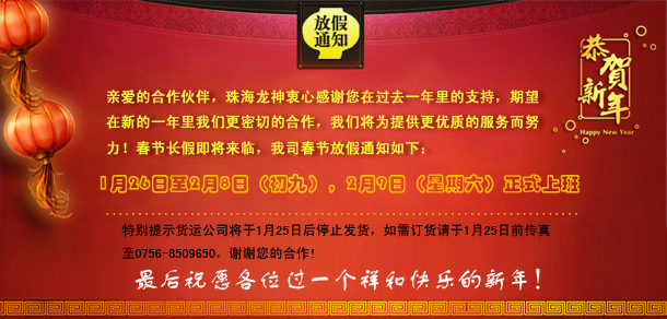 2014年春節(jié)放假通知 2014-01-16 10643 親愛的合作伙伴,珠海龍神衷心感謝您在過去一年里的支持,期望在新的一年里我們更密切的合作,我們將為提供更優(yōu)質(zhì)的服務(wù)而努力!春節(jié)長假即將來臨,我司春節(jié)放假通知如下:1月26日至2月8日(初九),2月9日(星期六)正式上班。特別提示貨運(yùn)公司將于1月25日后停止發(fā)貨,如需訂貨請于1月25日前傳真至0756-8509650,謝謝您的合作!最后祝愿各位過一個(gè)祥和快樂的新年!