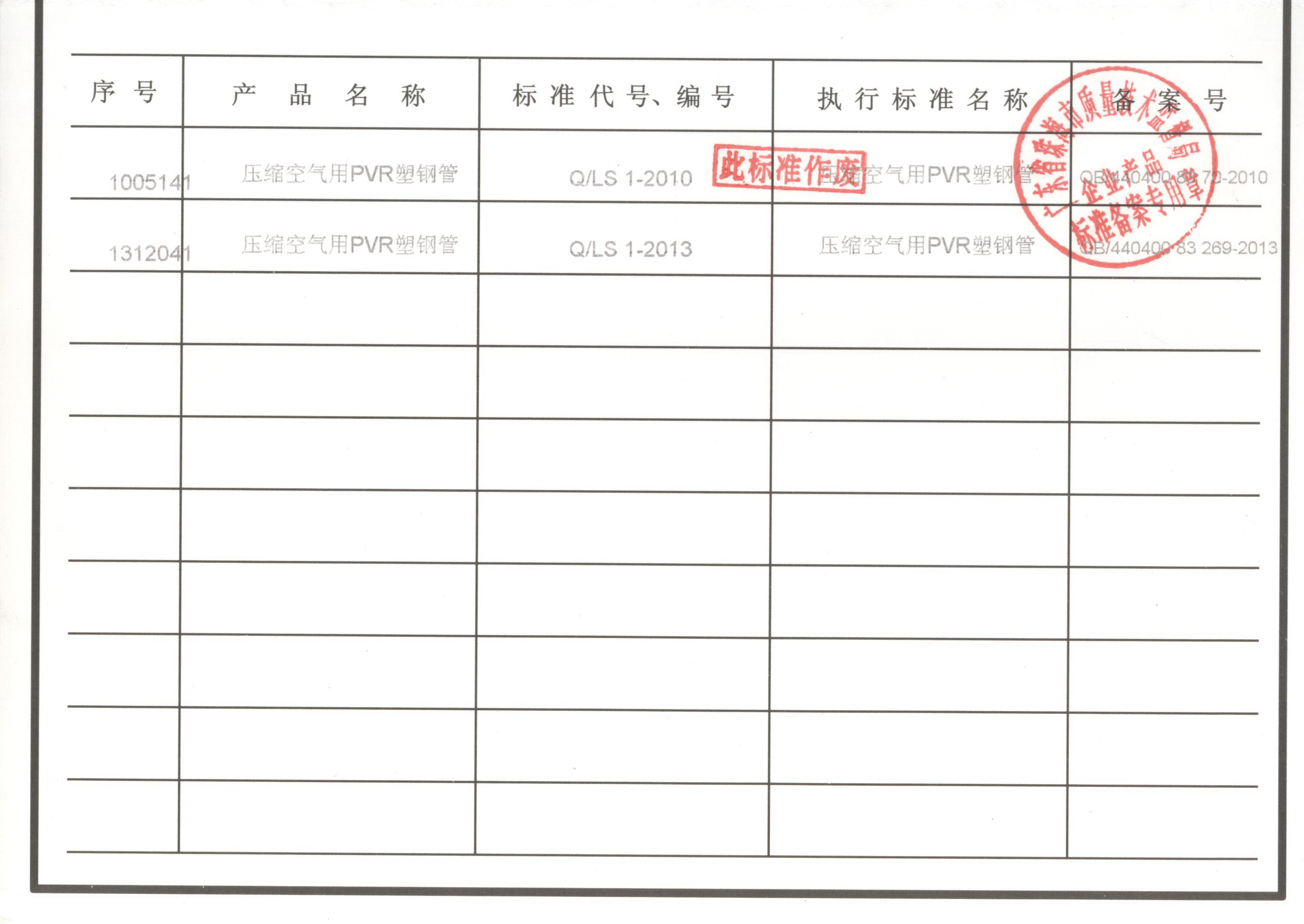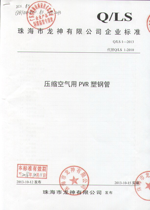 企業(yè)執(zhí)行標(biāo)準(zhǔn) 珠海市企業(yè)產(chǎn)品執(zhí)行標(biāo)準(zhǔn)證書 珠海市龍神有限公司企業(yè)執(zhí)行標(biāo)準(zhǔn) 壓縮空氣用PVR塑鋼管 2012-11-27 35134