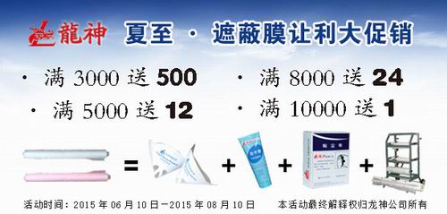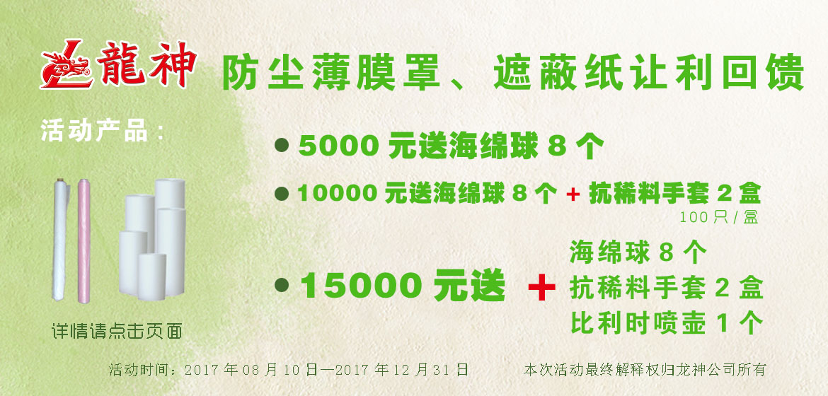 夏季讓利大回饋,遮避膜優(yōu)惠大促銷 2015-06-05 30130 買滿3000元,贈(zèng)送紙漏斗500個(gè); 買滿5000元,贈(zèng)送除漆洗手膏1箱; 買滿8000元,贈(zèng)送標(biāo)準(zhǔn)抹塵布1箱/24盒; 買滿10000元,贈(zèng)送小切紙架1臺(tái) 。