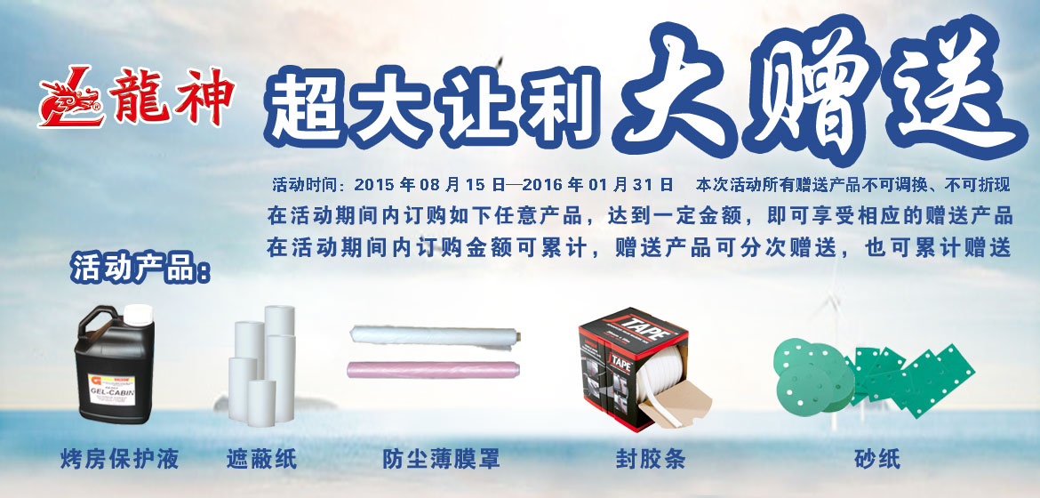超大讓利﹒大贈(zèng)送 2015-08-17 31833 訂購產(chǎn)品:1、烤房保護(hù)液; 2、遮蔽膜; 3、遮蔽紙; 4、泡沫膠條; 5、砂紙。 在活動(dòng)期間內(nèi)訂購如上任意產(chǎn)品,達(dá)到下表累計(jì)金額,即可享受相應(yīng)的贈(zèng)送產(chǎn)品。